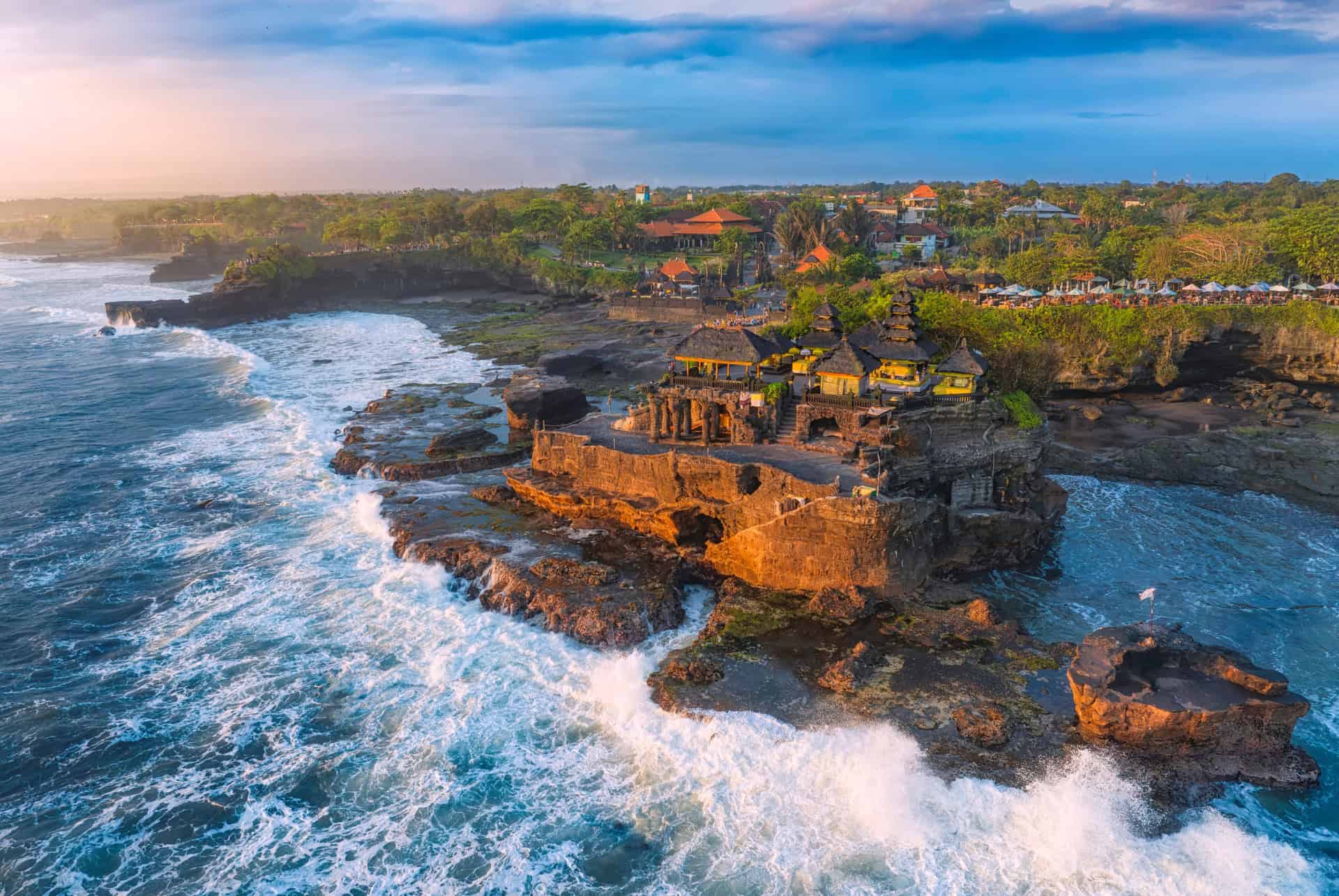 Le temple de Tanah Lot, perché sur un rocher, est l’un des sanctuaires océaniques les plus emblématiques de l’île. Selon les croyances balinaises, il protège Bali des influences maritimes néfastes. L’accès se fait à pied uniquement à marée basse et l’intérieur est interdit aux visiteurs. Cependant, le temple offre un spectacle exceptionnel au coucher du soleil, ce qui justifie largement la visite guidée !